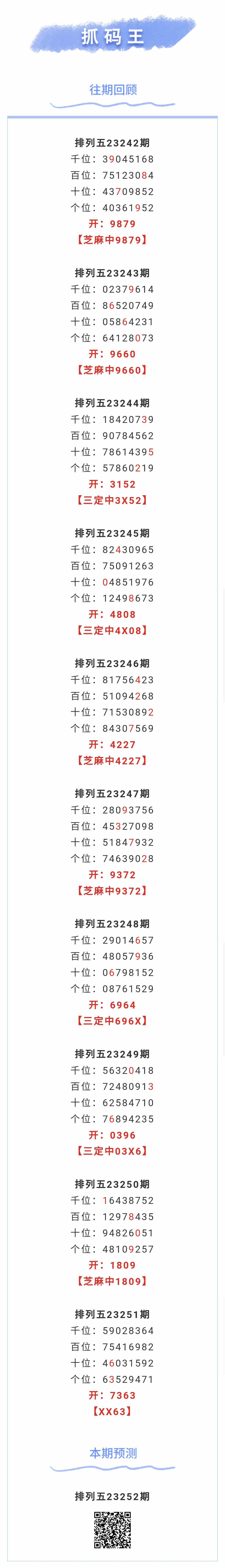 【排列五-252期】本月圈中8次芝麻,芝麻近10中5;上期XX63