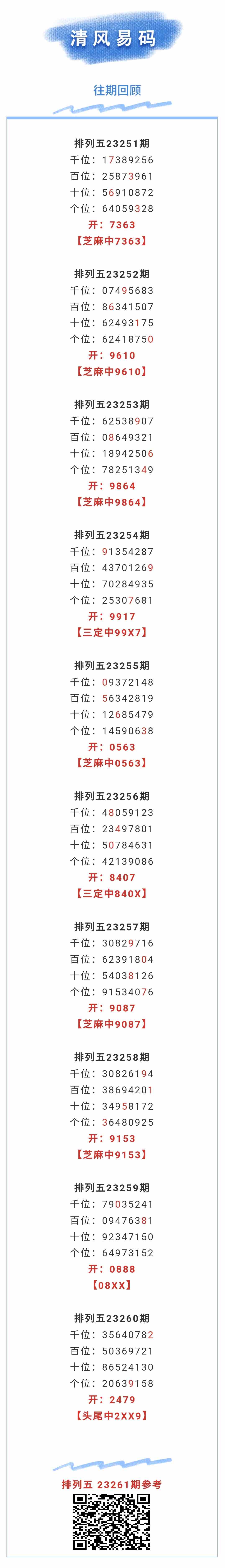 【排列五-261期】本月圈中17次芝麻,芝麻近10中6;上期头尾中2XX9