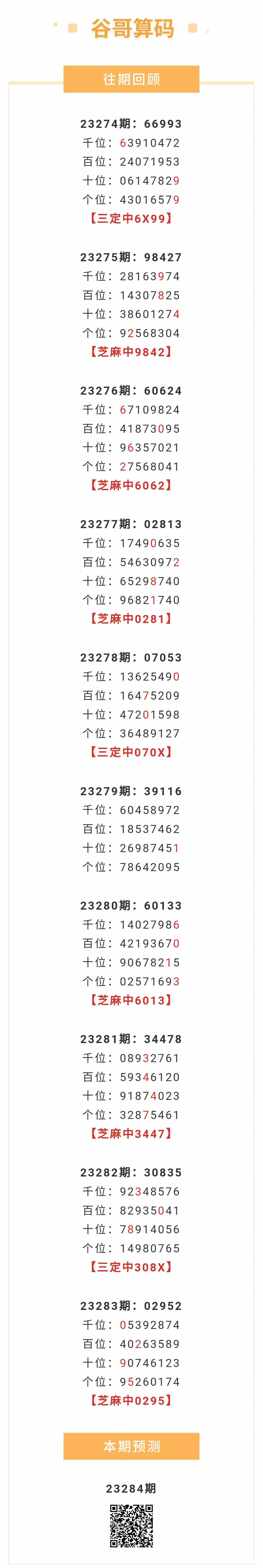 【排列五-284期】本月圈中11次芝麻,芝麻近10中6;上期芝麻中0295