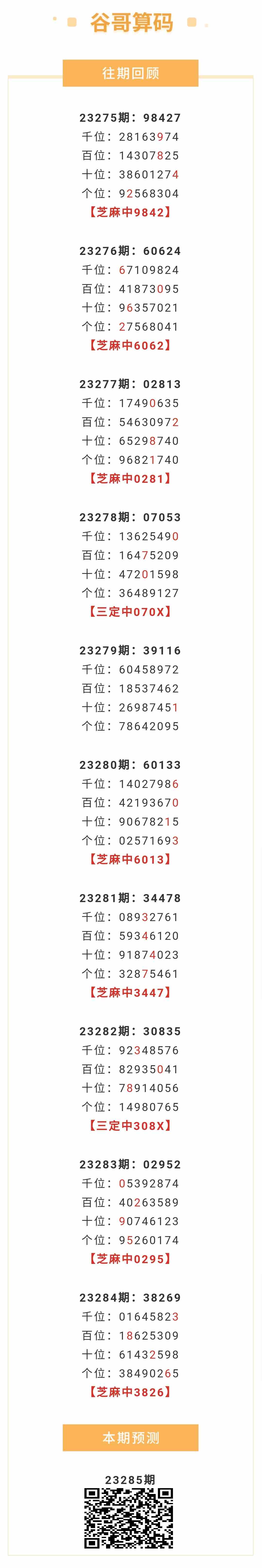【排列五-285期】本月圈中12次芝麻,芝麻近10中7;上期芝麻中3826