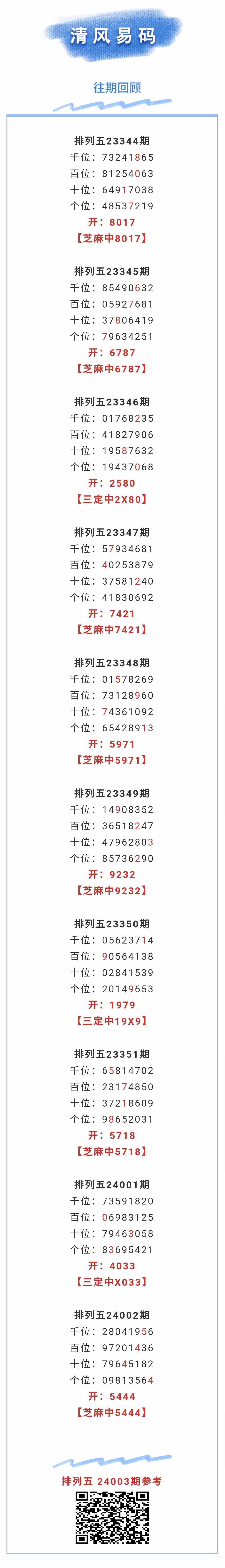 【排列五-003期】本月圈中1次芝麻,芝麻近10中7;上期芝麻中5444