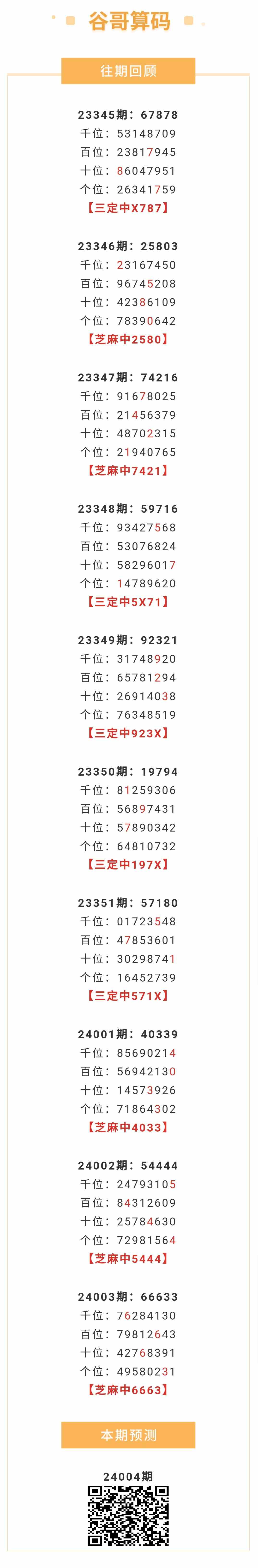 【排列五-004期】本月圈中3次芝麻,芝麻近10中5;上期芝麻中6663