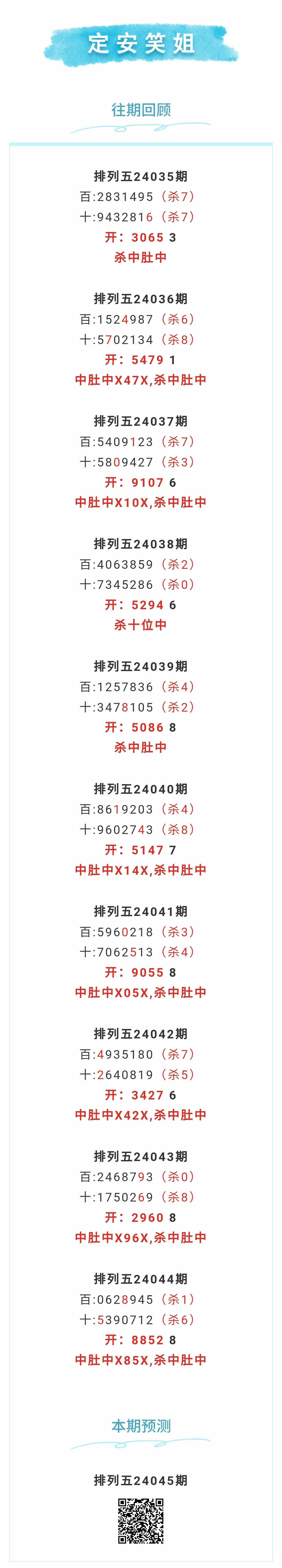 【排列五-045期】本月圈中7次中肚,中肚近10中7;上期中肚中X85X,杀中肚中