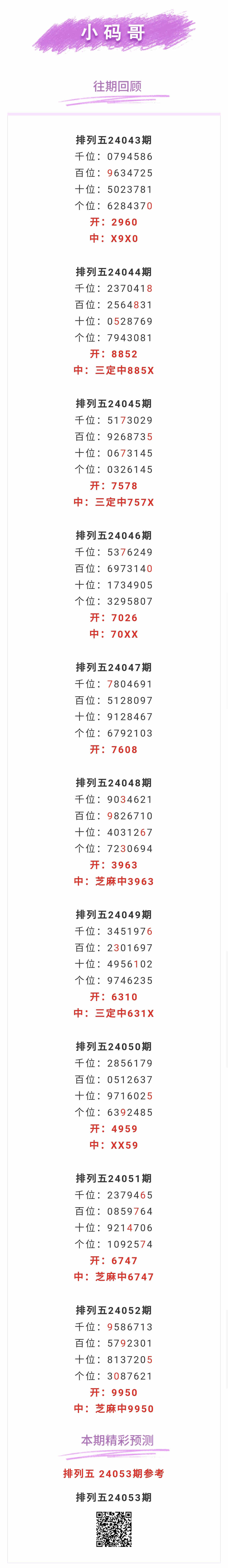 【排列五-053期】本月圈中2次芝麻,芝麻近10中3;上期芝麻中9950