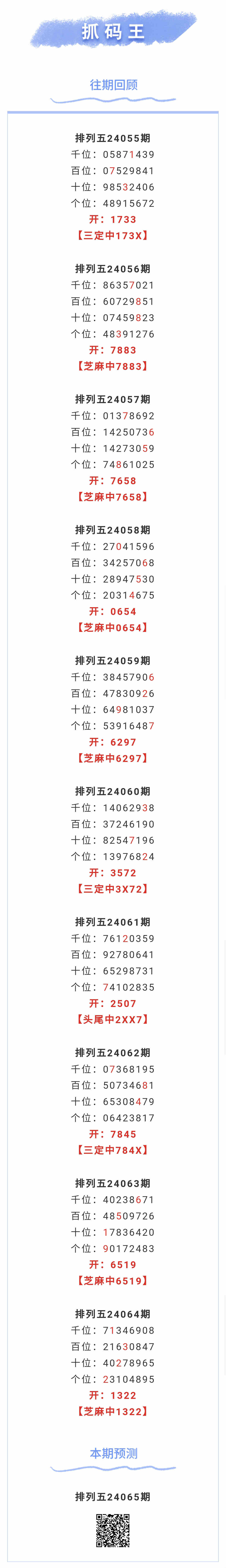 【排列五-24065期】本月圈中7次芝麻,芝麻近10中6;上期芝麻中1322