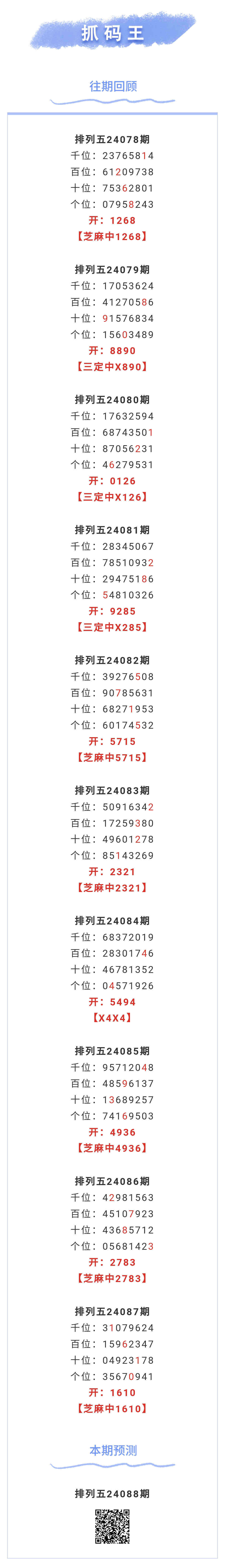 【排列五-088期】本月圈中5次芝麻,芝麻近10中6;上期芝麻中1610