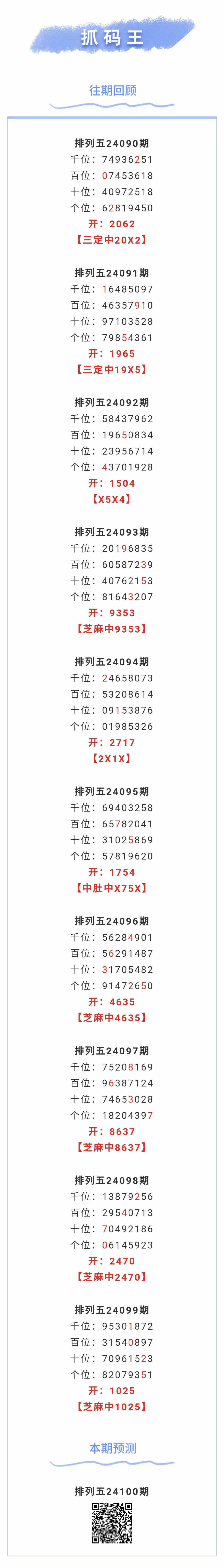 【排列五-100期】本月圈中11次芝麻,芝麻近10中5;上期芝麻中1025