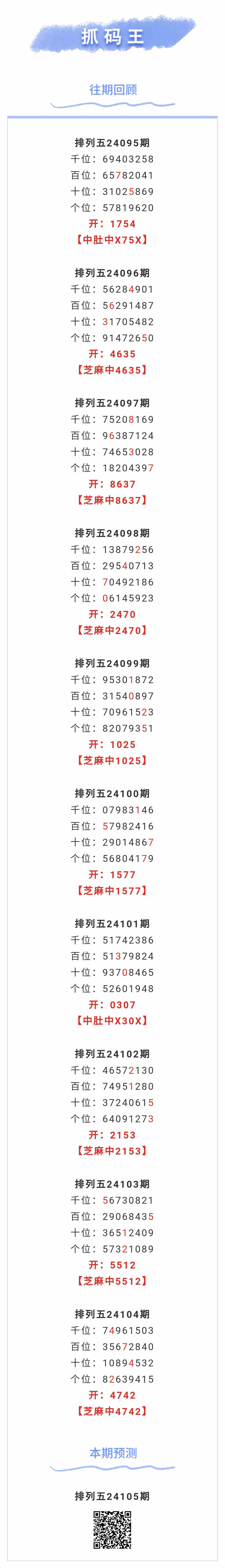 【排列五-105期】本月圈中15次芝麻,芝麻近10中8;上期芝麻中4742
