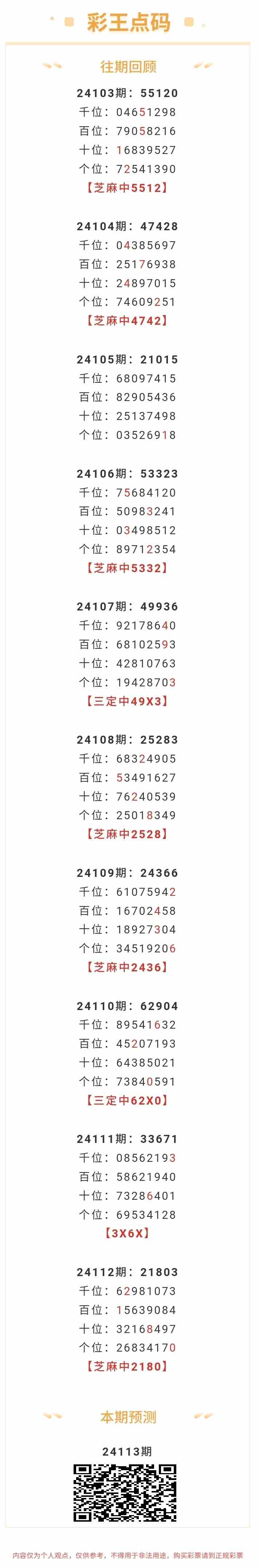 【排列五-113期】本月圈中1次芝麻,芝麻近10中6;上期芝麻中2180