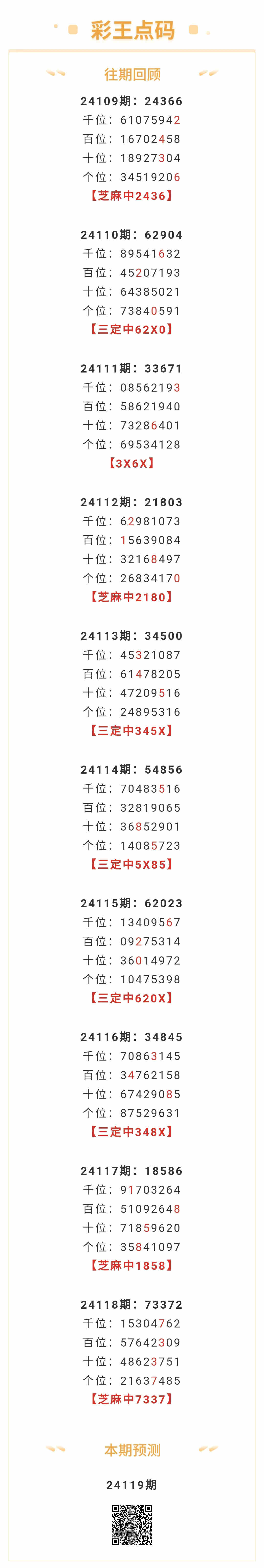 【排列五-119期】本月圈中3次芝麻,芝麻近10中4;上期芝麻中7337