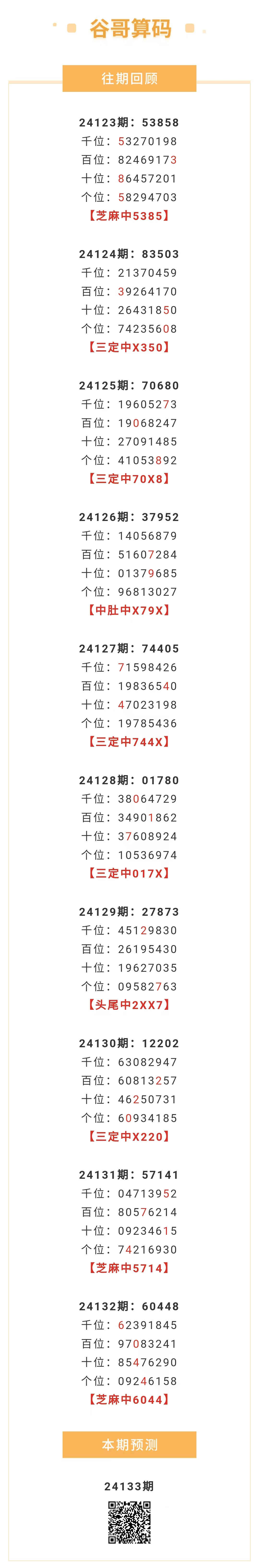 【排列五-133期】本月圈中8次芝麻,芝麻近10中3;上期芝麻中6044