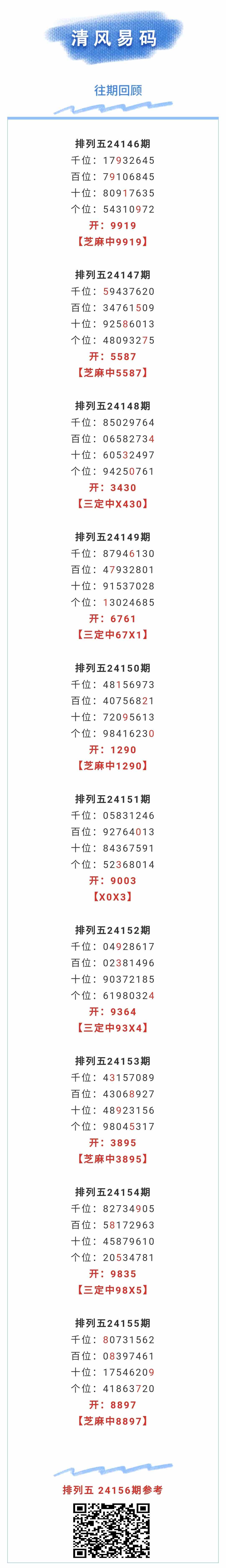 【排列五-156期】本月圈中6次芝麻,芝麻近10中5;上期芝麻中8897