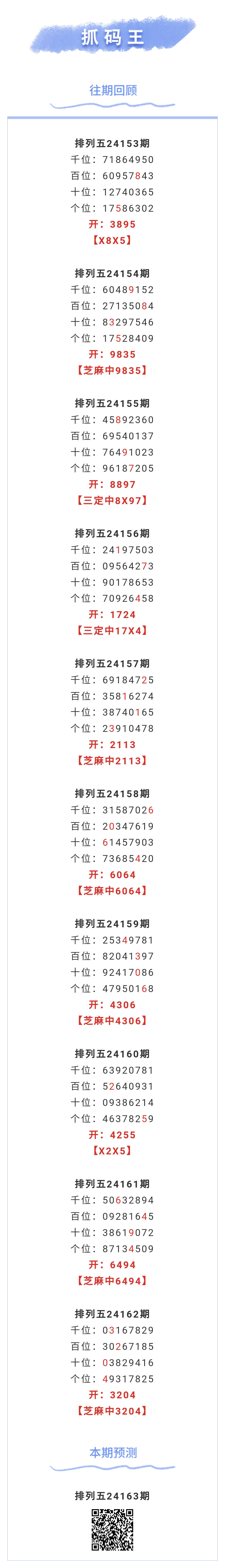 【排列五-163期】本月圈中9次芝麻,芝麻近10中6;上期芝麻中3204