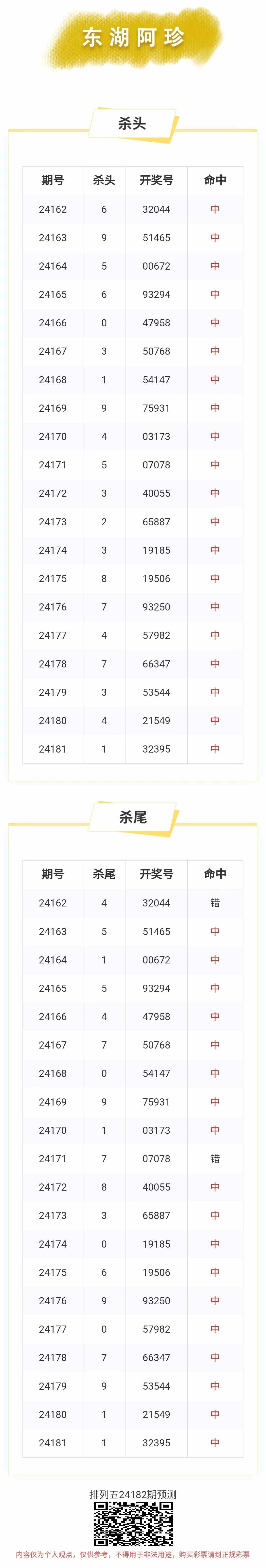 【排列五-182期】本月圈中10次杀头尾,杀头尾近10中10;上期杀头尾中