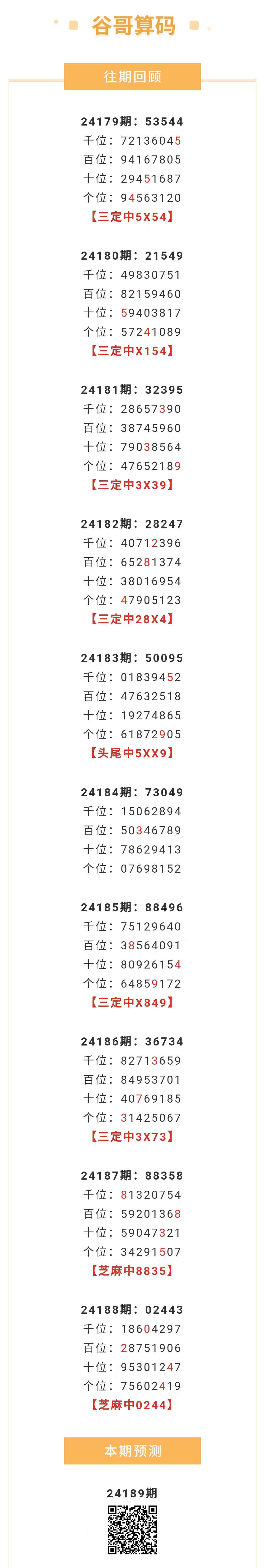 【排列五-189期】本月圈中6次芝麻,芝麻近10中2;上期芝麻中0244