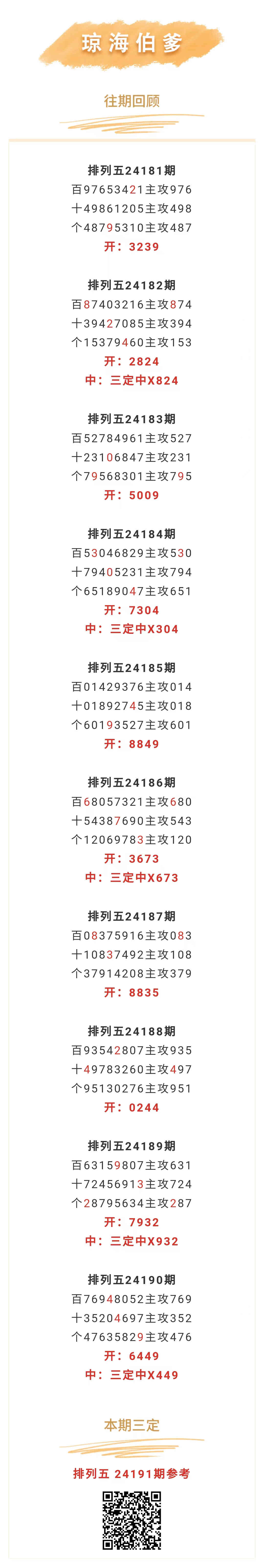 【排列五-24191期】本月圈中10次三定,三定近10中5;上期三定中X449