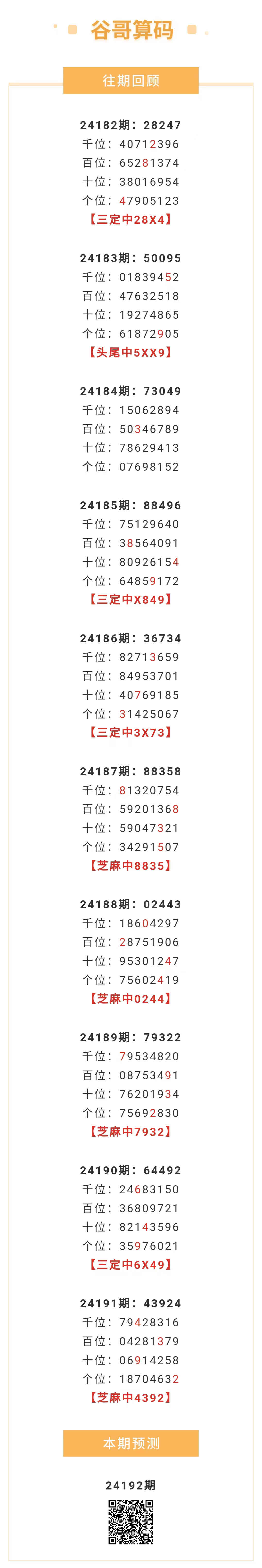 【排列五-192期】本月圈中8次芝麻,芝麻近10中4;上期芝麻中4392