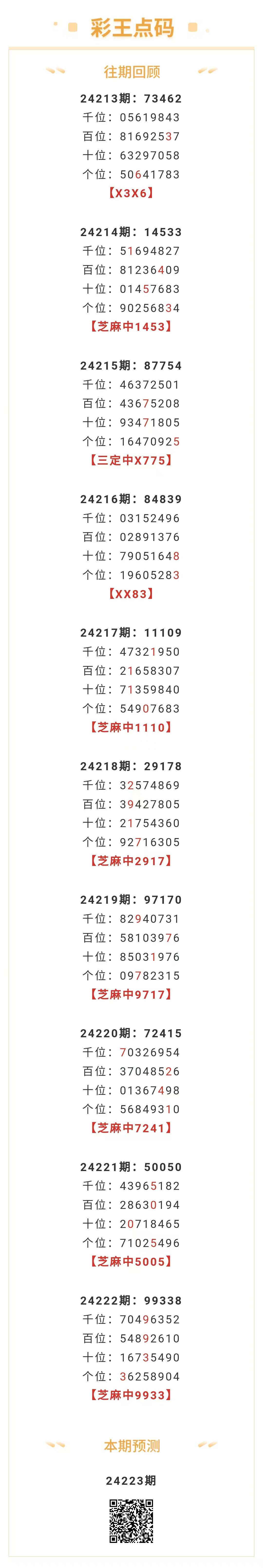 【排列五-223期】本月圈中13次芝麻,芝麻近10中7;上期芝麻中9933