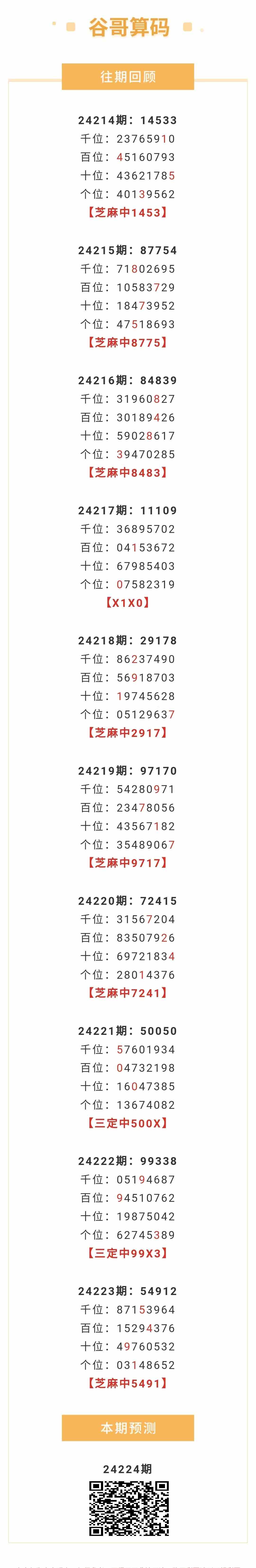 【排列五-224期】本月圈中12次芝麻,芝麻近10中7;上期芝麻中5491