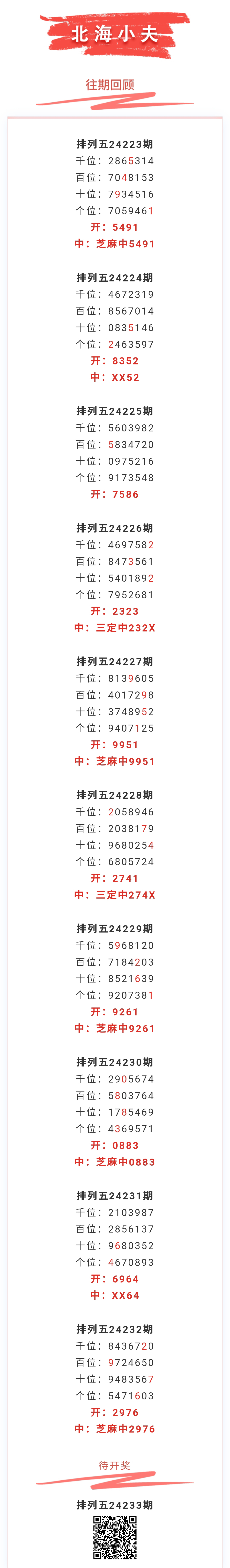 【排列五-233期】本月圈中13次芝麻,芝麻近10中5;上期芝麻中2976