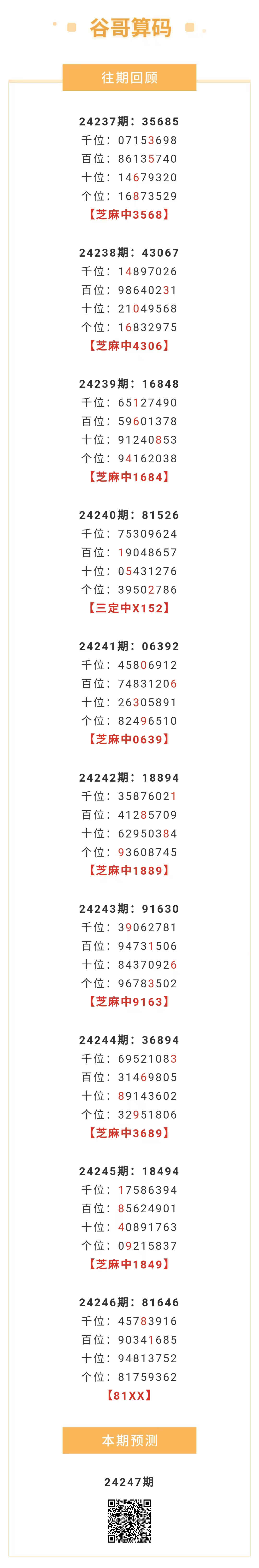 【排列五-247期】本月圈中10次芝麻,芝麻近10中8;上期81XX