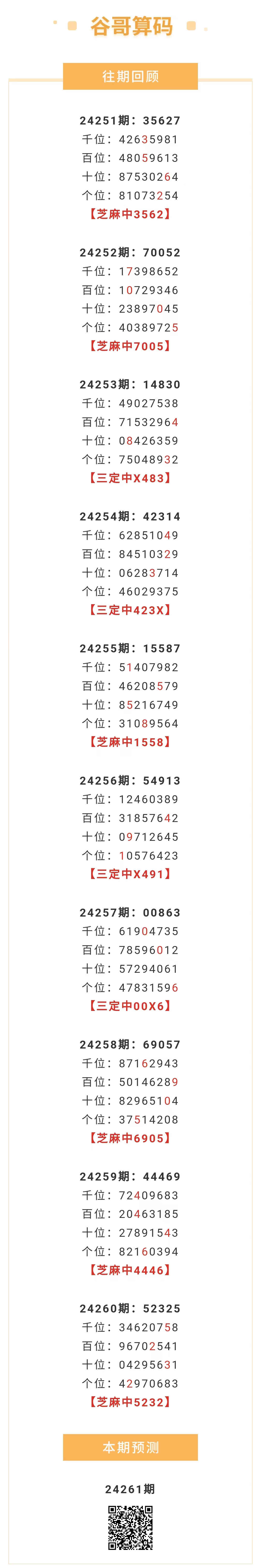 【排列五-261期】本月圈中18次芝麻,芝麻近10中6;上期芝麻中5232