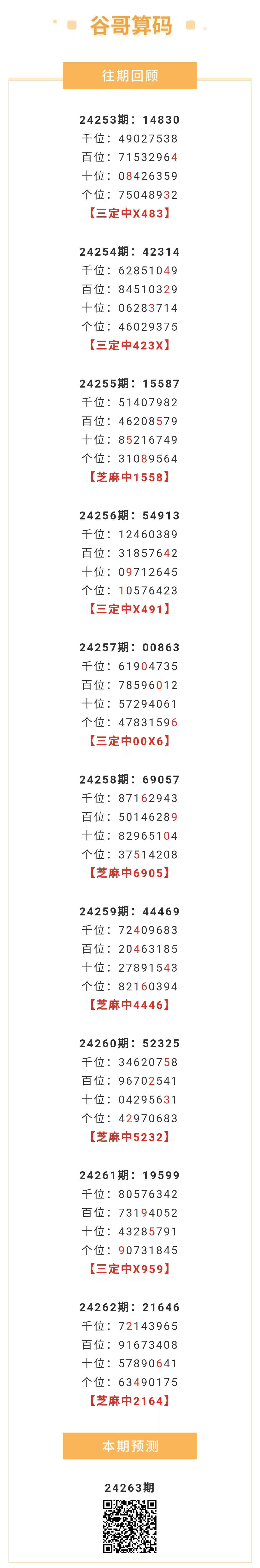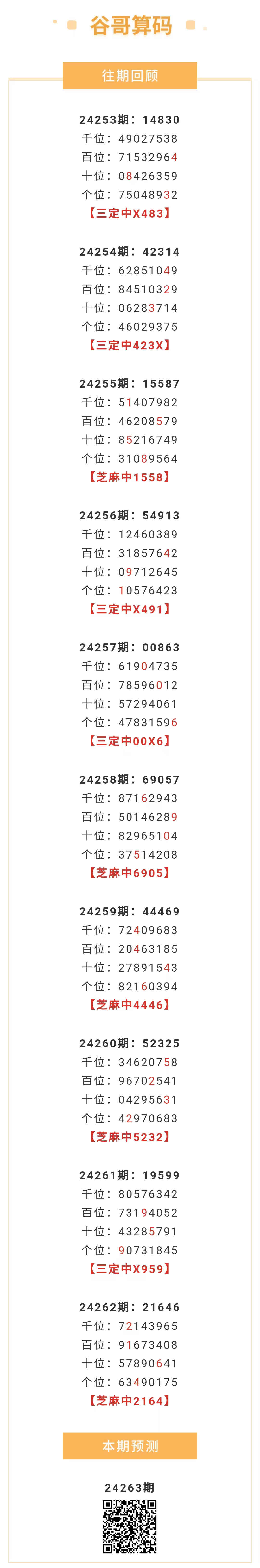 【排列五-263期】本月圈中19次芝麻,芝麻近10中5;上期芝麻中2164