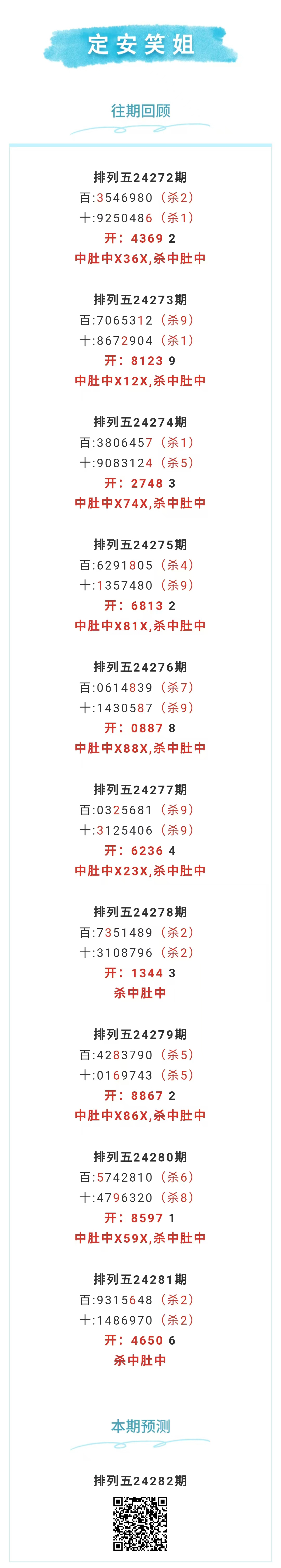 【排列五-282期】本月圈中11次中肚,中肚近10中8;上期杀中肚中