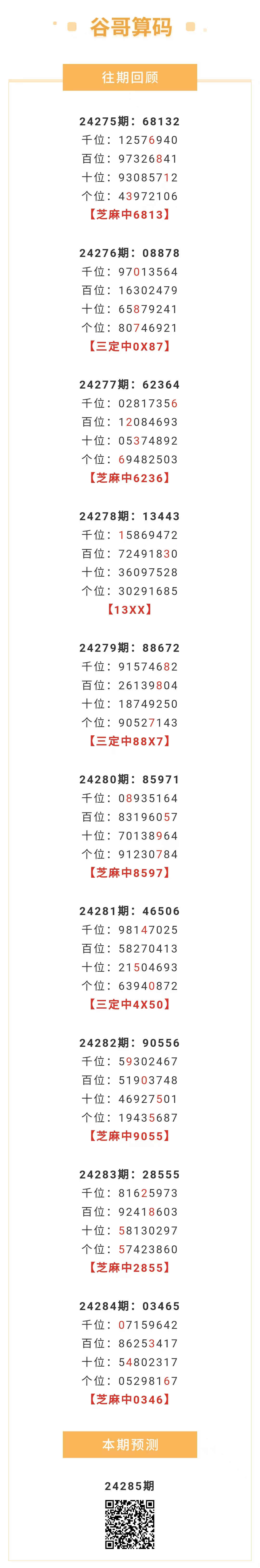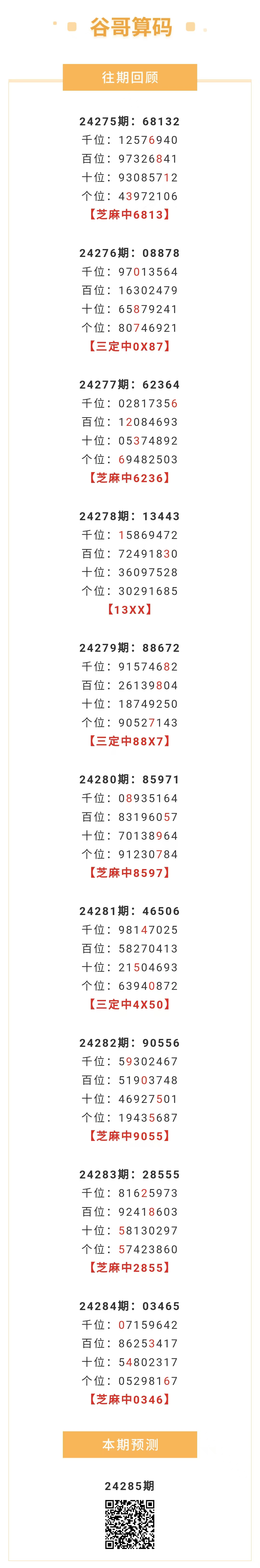 【排列五-285期】本月圈中8次芝麻,芝麻近10中6;上期芝麻中0346