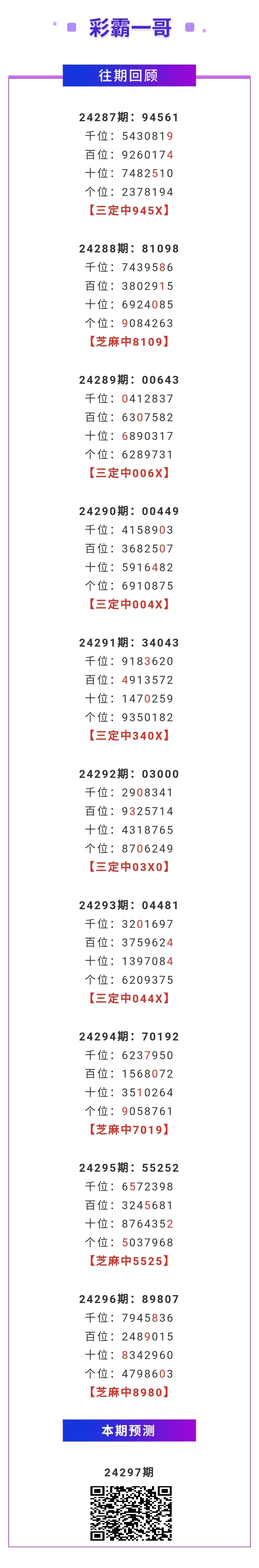 【排列五-24297期】本月圈中3次芝麻,芝麻近10中4;上期芝麻中8980