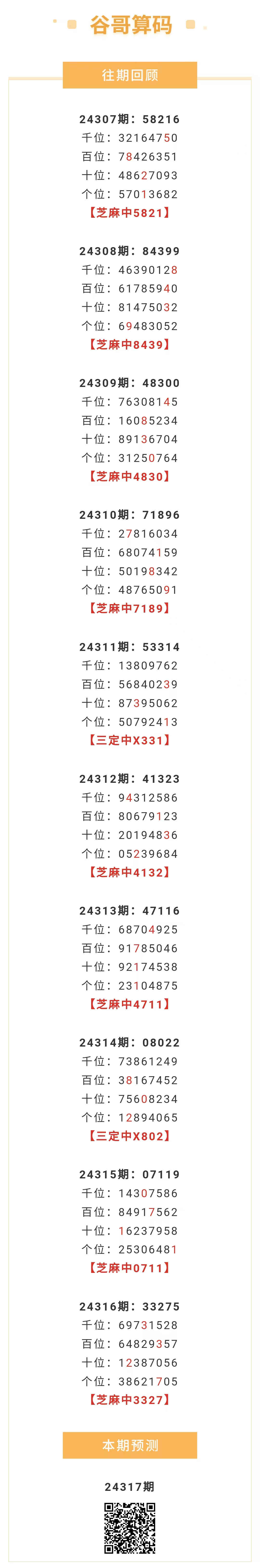 【排列五-317期】本月圈中14次芝麻,芝麻近10中8;上期芝麻中3327