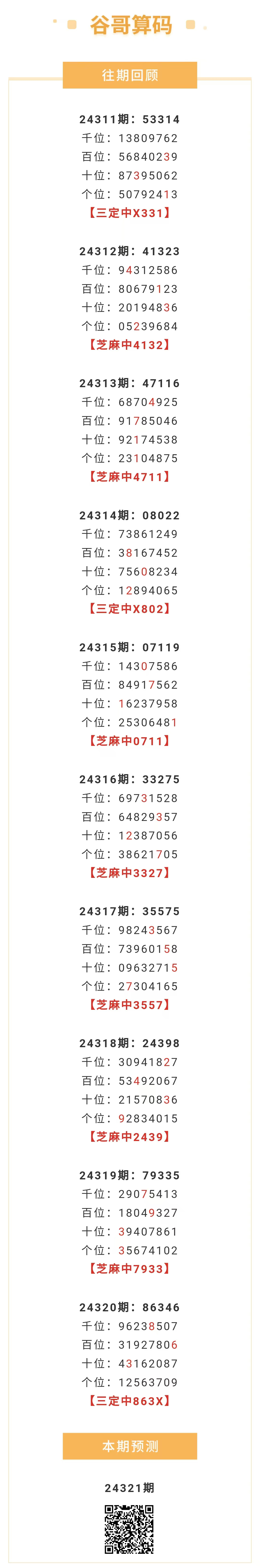 【排列五-321期】本月圈中17次芝麻,芝麻近10中7;上期三定中863X