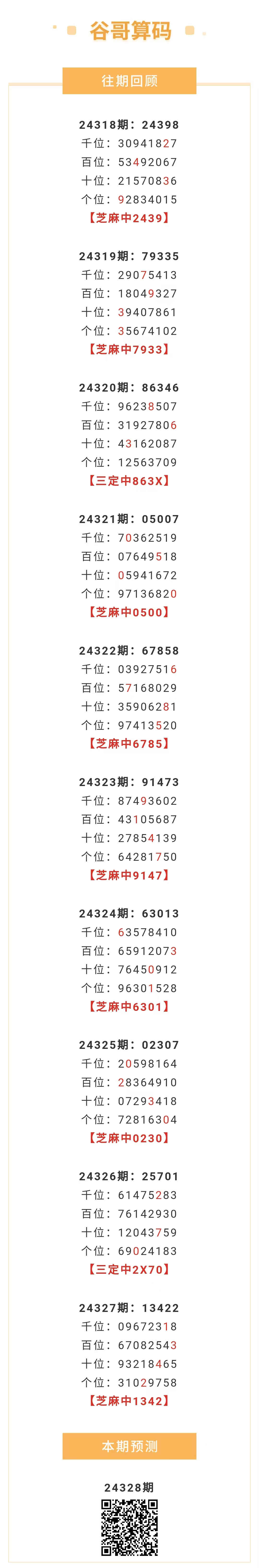 【排列五-328期】本月圈中5次芝麻,芝麻近10中8;上期芝麻中1342