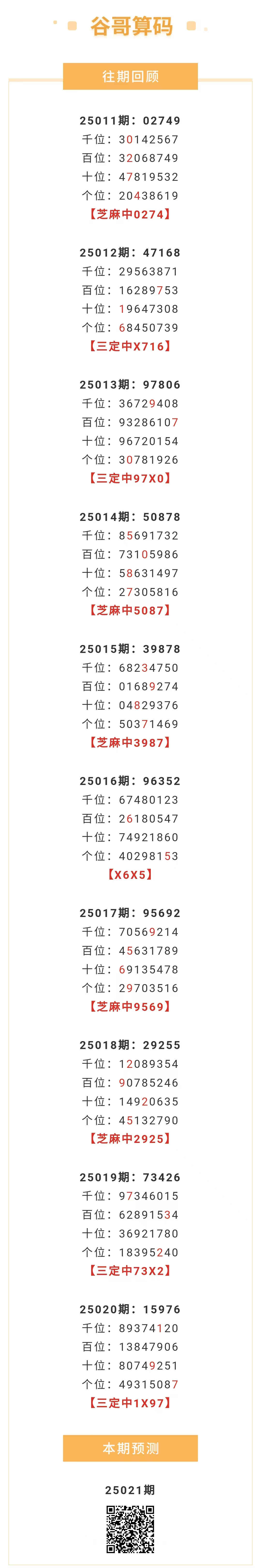【排列五-021期】本月圈中11次芝麻,芝麻近10中5;上期三定中1X97