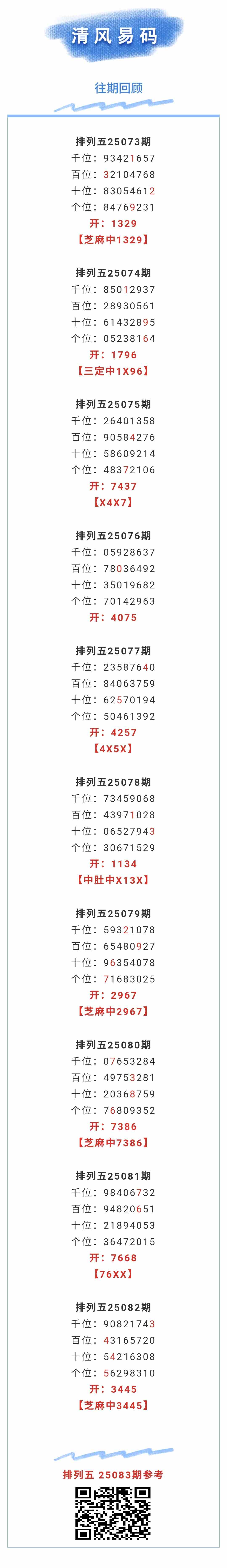 【排列五-25083期】上月圈中10次芝麻,芝麻近10中4;上期芝麻中3445