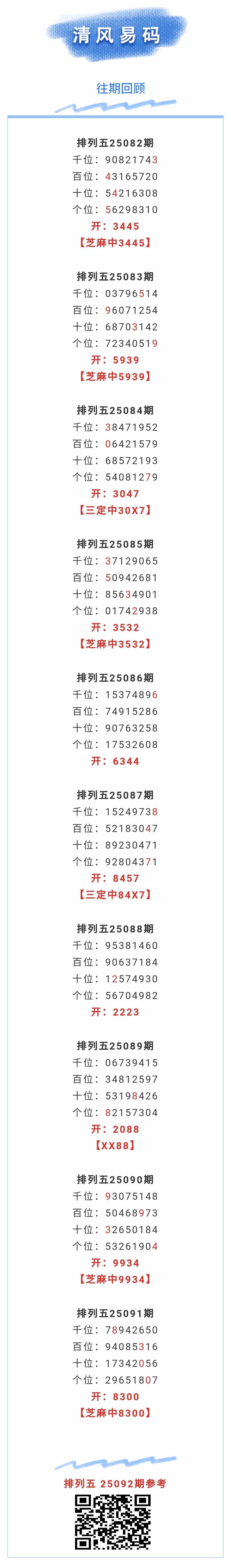 【排列五-092期】本月圈中5次芝麻,芝麻近10中5;上期芝麻中8300