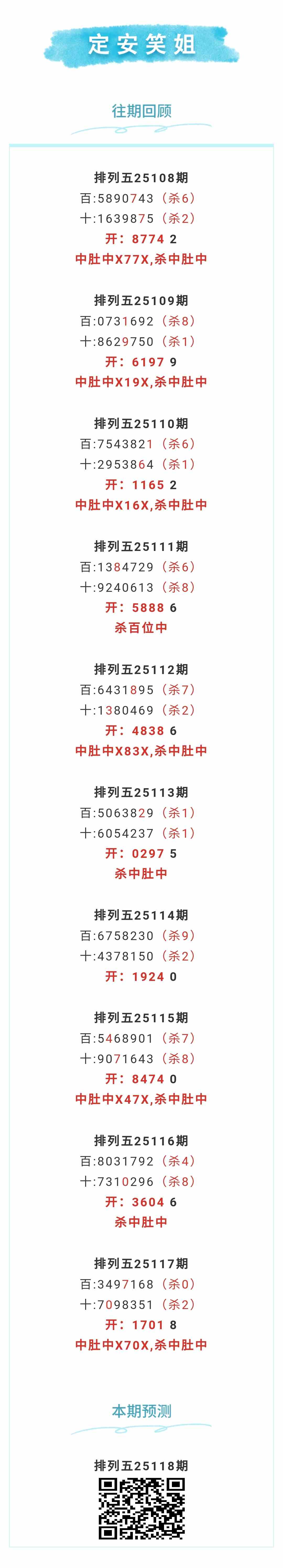 【排列五-118期】本月圈中3次中肚,中肚近10中6;上期中肚中X70X,杀中肚中