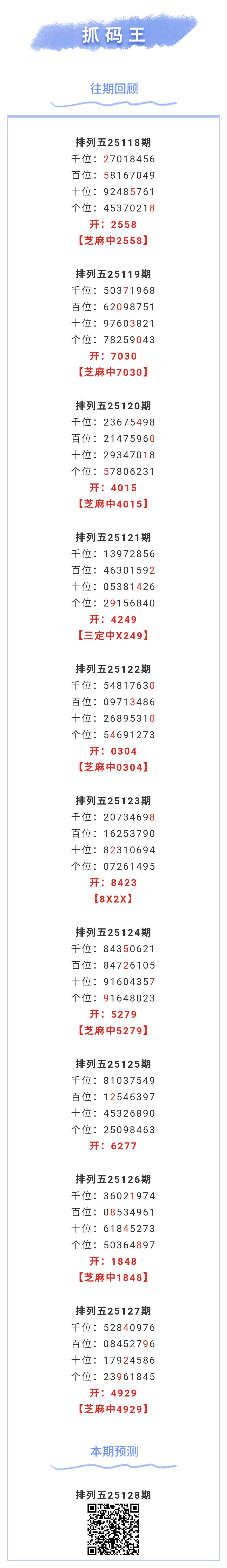 【排列五-128期】本月圈中8次芝麻,芝麻近10中7;上期芝麻中4929