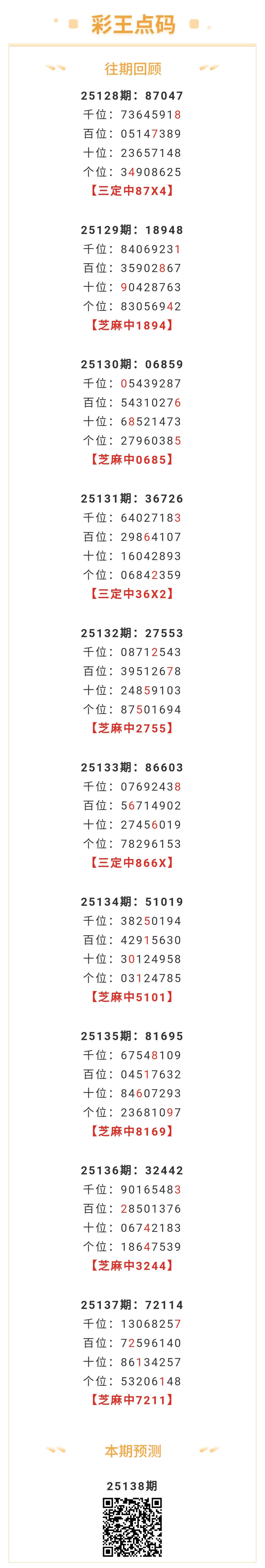 【排列五-138期】本月圈中13次芝麻,芝麻近10中7;上期芝麻中7211