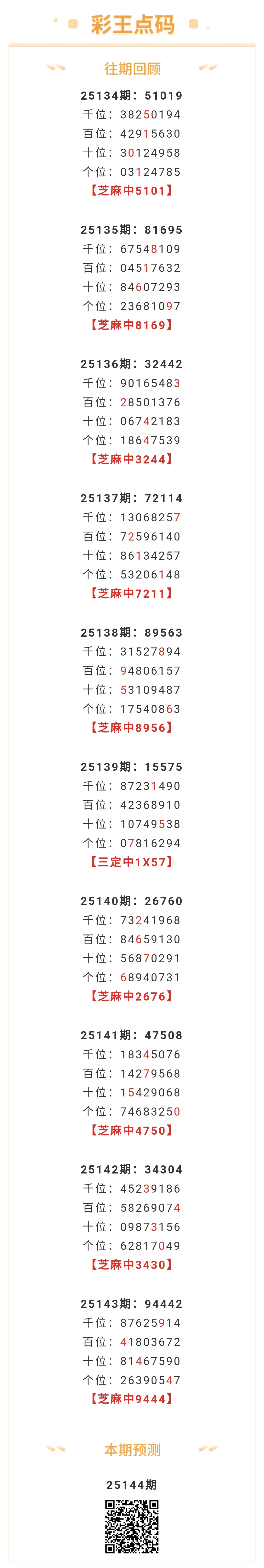【排列五-144期】上月圈中16次芝麻,芝麻近10中9;上期芝麻中9444