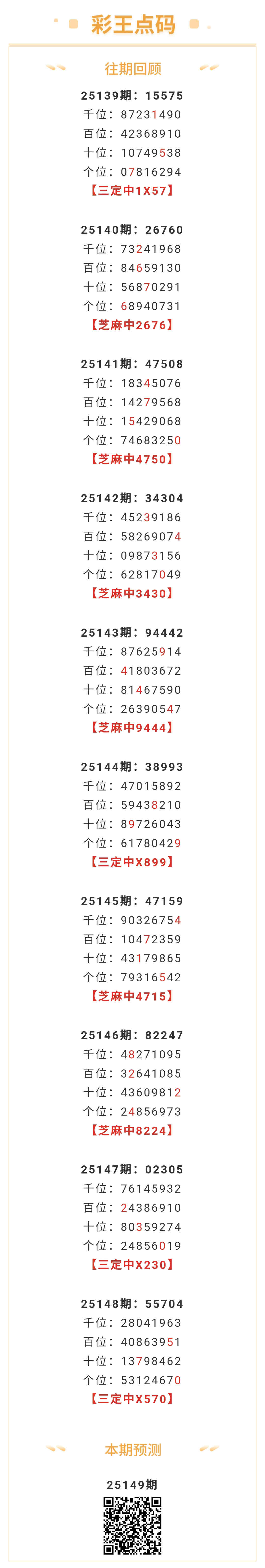 【排列五-25149期】本月圈中4次芝麻,芝麻近10中6;上期三定中X570