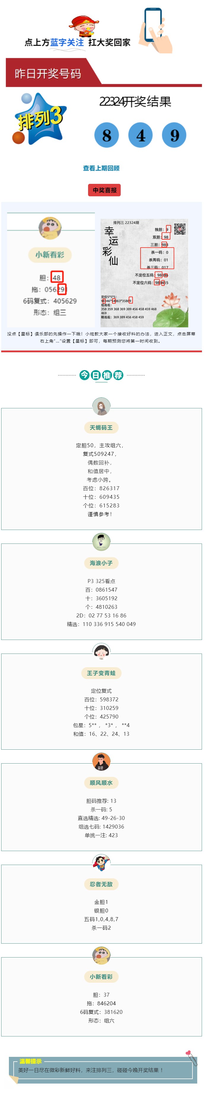 排列三“小新看彩”胆拖中849!