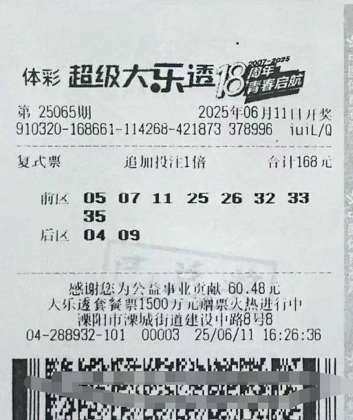 幸运很快降临,6月11日傍晚,张先生在常州溧阳市3204288932体彩网点购买了一张“8+2”复式追加票,前区号码为“05、07、11、25、26、32、33、35”,后区号码为“04、09”。当晚,大乐透第25065期开奖,开奖号码为“07、25、32、33、35+04、09”。除了中得1注追加投注一等奖,张先生还中了15注四等奖、30注六等奖、10注八等奖,总奖金为18051150元。