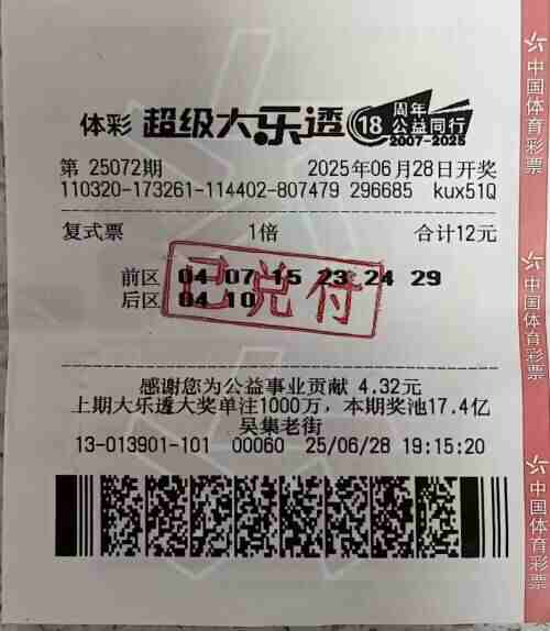 6月28日,体彩大乐透第25072期开奖,前区“04、07、15、24、29”,后区“01、04”。宿迁市沭阳县3213013901体彩网点传来喜讯,购彩者周先生凭借一张12元6+2单倍复式票,喜中二等奖1注、五等奖5注,奖金共计126666元。