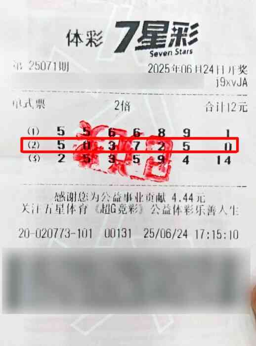 6月24日,中国体育彩票7星彩第25071期开奖,全国共产生5注一等奖,分别为:上海(2注)、福建(2注)、河南(1注)。上海2注7星彩一等奖均出自松江区车墩镇联营路147号,体彩编号为20773体彩网点。