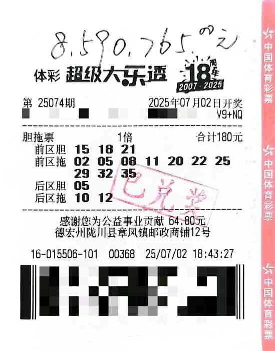 好运不停!7月2日开奖的第25074期,德宏陇川购彩者再下一城,采用 “前区3胆10拖+后区1胆2拖” 的胆拖投注法,将当期头奖859万元收入囊中。