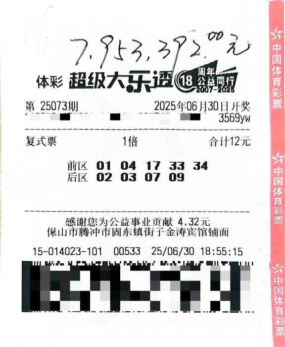 6月30日晚开奖的第25073期,保山腾冲购彩者凭借一张12元的 “5+4”小复式票,精准命中当期头奖,总奖金达795万元。这张中奖票前区果断锁定5个号码,后区覆盖4个号码,这张傍晚18:55出票的复式票,成功激活了滇西小城的夏夜狂欢。