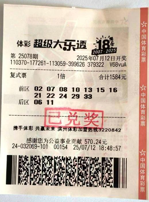 7月12日,超级大乐透第25078期开奖,开奖号码为前区:07、10、15、21、24,后区:05、06,全国共中出一等奖5注,幸运的滨州购彩者王先生(化姓)通过复式投注摘得二等奖1注,五等奖35注、八等奖210注、九等奖350注,累计获得奖金81862元。