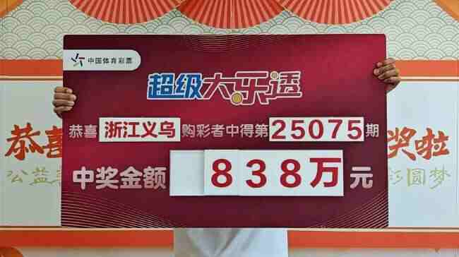 7月5日,体彩大乐透第25075期开奖,当期全国中出9注一等奖,单注奖金838万元。义乌中出1注一等奖,单票奖金838万元。