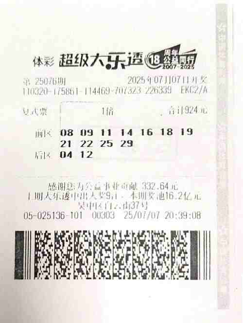 7月7日,超级大乐透第25076期开出的中奖号码为“11、18、22、25、29+04、12”,当期开出1注1800万元追加投注一等奖和6注1000万元基本投注一等奖,其中1注一等奖花落苏州3205025136网点。